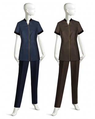 • Short sleeve tunic with stand up collar and asymmetric neckline